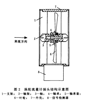 涡轮流量计的工作原理示意图如图1所示。在管道中心安放一个涡轮,流体通过时冲击涡轮叶片,对涡轮产生驱动力矩,使涡轮克服摩擦力矩和流体阻力矩而产生旋转,其旋转角速度与流体流速正相关。 由检测探头检测出叶片转动频率,输入流量显示积算仪得到瞬时流量和累计流量。