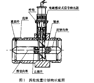 ①法兰夹装式大香蕉啪啪啪:涡轮流量计是一种流量测量仪表,流动流体的动力驱使涡轮叶片旋转,其旋转速度与体积流量近似成比例(线性关系)。信号输出方式包括脉冲、模拟量或数字通信方式。结构原理见图1。