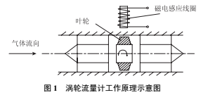 1、涡轮流量计的测量原理涡轮流量计是一种速度式流量仪表,测量本体是涡轮流量传感器,主要由叶轮和磁电感应线圈组成,叶轮轴心与管道中心相同,可以自由转动,其叶片与气体流动方向成一定角度。在流体冲击下,涡轮沿管道轴向旋转,其旋转速率随流量变化而不同,流速越高,动能越大,涡轮的转速也越高。涡轮的转速经磁电感应转换器转换为相应频率的电脉冲,通过显示仪表进行积算和显示(图1)。