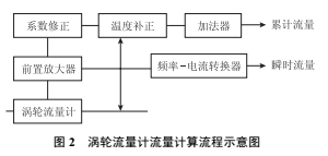 涡轮流量计通过不同的计算方法,可分别显示累计流量和瞬时流量。当涡轮叶片切割壳体内永久磁钢产生的磁力线时,将引起传感线圈磁通的变化,磁通周期变化信号经前置放大器放大、整形,产生与流速成正比的脉冲信号,脉冲信号经流量积算电路换算后显示累积流量值,同时经频率电流转换电路转换成模拟电流量,进而显示瞬时流量值(图 2)。