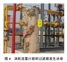 通过逐项排查,发现流量计前面的过滤器和流量计后的调压装置存在一定程度的冰堵(图4)。采取管道排污、辅助加热、清洗过滤器及调低流量计入口压力至4.0MPa等措施,改善了天然气的节流效应,使涡轮流量计能够正常运行。经与下游门站涡轮流量计比对,输差控制在有效范围。