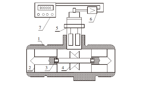 1 壳体,2 前导流板,3 轴承,4 涡轮,5 变送器,6 前置放大器,7二次仪表