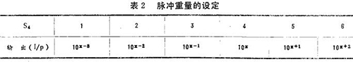 脉冲重量设定用S4插头选择进行,它的设定有一定的条件,这些条件是脉冲输出的类型、脉冲宽度和刻定常数。并且它的选择范围还要依据脉冲宽度和*大测量流量-口-口口-l0的X方(m3/h)来确定。其系数-(数字同*大流量m3/h)由*大流量的前三位有效数定决定,而对应于“x”值的脉冲重量(l/p)见表2。