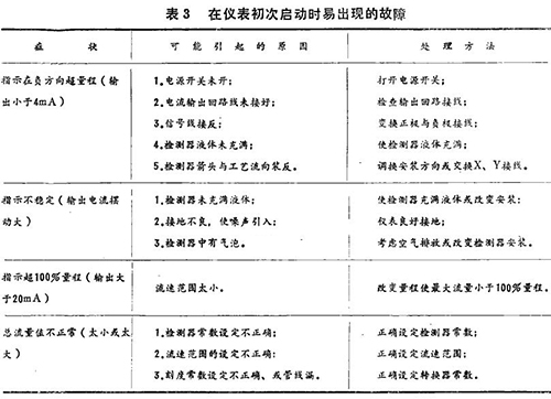 在仪表指示不正常时,可根据下面介绍的一些典型故障和处理方法进行必要的处理。这些故障可分为启动时易产生的故障,正常运行时出现的故障和接地不良引起的故障(见表3、表4)。
