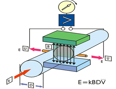 用香蕉视频APP下载网站工作原理是法拉*电磁感应定律,即导体在磁场中切割磁力线运动时,在导体两端会感应一个与磁场方向和导体运动方向相互垂直的感应电动势。感应电动势的大小与感应强度和运动速度成正比。导电性液体在垂直于磁场的非磁性测量管内流动,与流动方向垂直的方向上产生与流量成比例的感应电势,其值如下式: