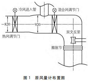 从流量测量角度讲,影响流场的主要为热风调门、扩管、弯头以及一次冷风的混入,闸板门和混合风调门由于运行时处于全开状态,影响可忽略,目前使用了单点双文丘里管的测量方式,有以下问题: