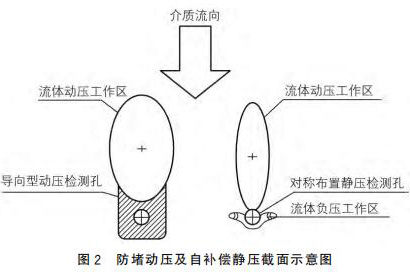 智能液体涡轮流量表采用抛物面导向型结构作为动压测点,采用对称自补偿型式的静压测点,可以有效地解决来流方向偏流时信号的稳定采集,来流偏离管道轴线时,可以维持输出差压基本不变,如图2所示。