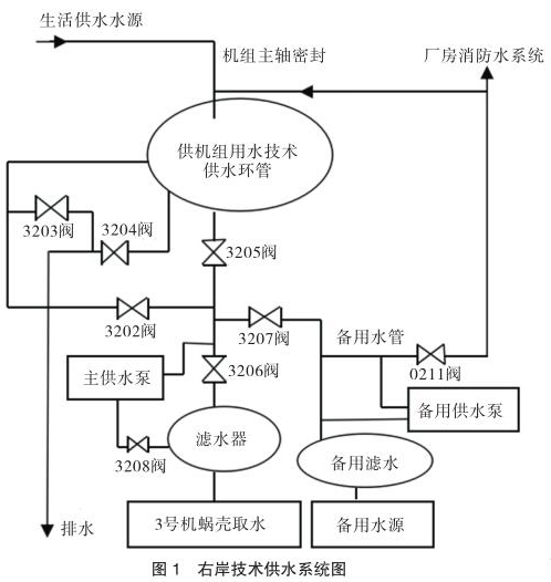 技术供水系统设有主、备用水源。主水源是蜗壳取水,作为机组技术供水的主用水源。备用水源有两个,一个是设在 1 号机段的坝前取水,取水口高程为 145m,另一个是同 4 号机组蜗壳取水共用取水口的蜗壳备用取水。两路备用水源均接到备用总水管,并通过 X207 阀分别与各台机组的技术供水系统相连通(见图 2)。
