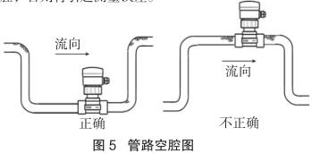 测量流向取决于燃油流量表的安装方位,将燃油流量表在接头上旋转 180 度即可反向。正流向时,燃油流量表的突耳应在上游方向。流量显示总是正的,而累加器可以根据流向增加或者减少。安装中确认管路设计不允许在介质中产生气泡或空腔,否则将引起测量误差(见图 5)。