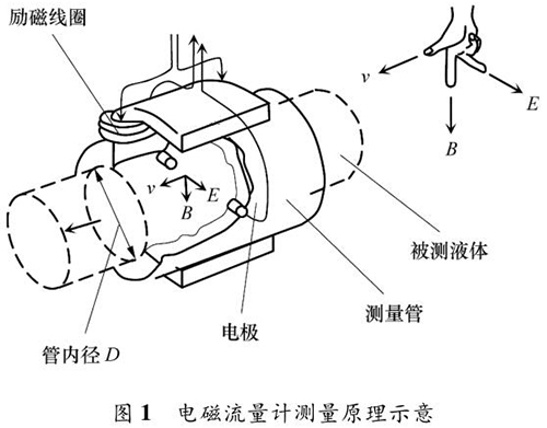 焦油流量计的测量原理如图 1 所示。根据法拉*电磁感应定律,导电液体在磁场中流动会产生电动势 E,它与磁感应强度 B、导电液体平均流速 v 成一定比例关系: