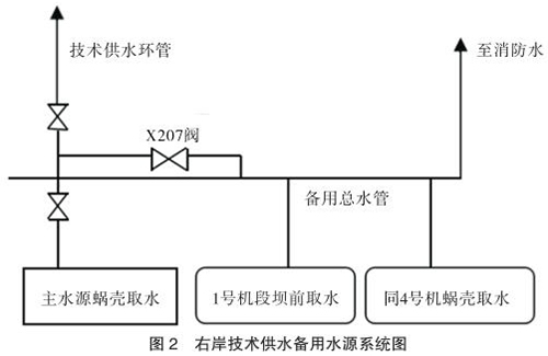 技术供水系统设有主、备用水源。主水源是蜗壳取水,作为机组技术供水的主用水源。备用水源有两个,一个是设在 1 号机段的坝前取水,取水口高程为 145m,另一个是同 4 号机组蜗壳取水共用取水口的蜗壳备用取水。两路备用水源均接到备用总水管,并通过 X207 阀分别与各台机组的技术供水系统相连通(见图 2)。