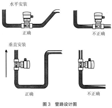 现场安装时应注意远离可能对其产生干扰的大型设备,防止长期的热辐射和其他如磁场直射等环境影响。为确保高测量精度和较好的零点稳定性,进行校正前,防冻液流量表应装入工艺介质中至少 24 小时电*钝化。安装的管路设计应确保管道始终充满流体,防止测量误差,管路设计图见图 3。