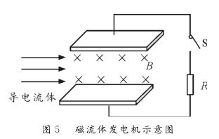 【例1】图5为磁流体发电机示意图。设两金属板间的距离为d,两*板间匀强磁场的磁感应强度为B。等离子体垂直进入磁场的速度为v,单个离子所带的电荷量为q。离子通道(即两*板内所围成的空间)的等效电阻为r,负载电阻为R。则下列判断正确的是(  )