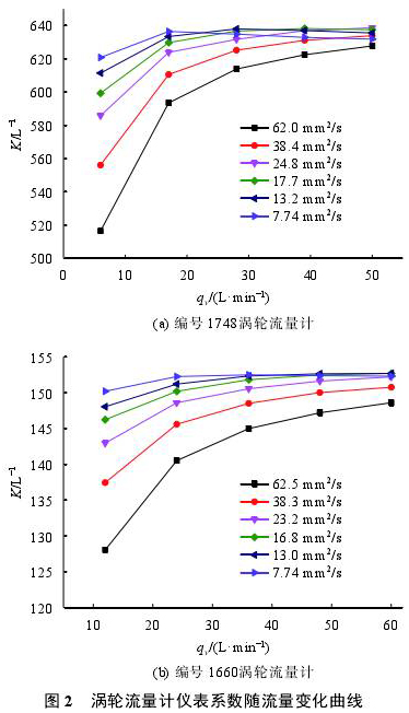 研究利用航空润滑油流量标准装置在20,30,40,50,60,80℃对10支甲醇流量计进行校准试验。CL-10型流量计校准流量点分别为6,17,28,39,50L/min;CL-15型流量计校准流量点分别为12,24,36,48,60L/min。图2是1748和1660两支甲醇流量计在各粘度点仪表系数随流量变化曲线。