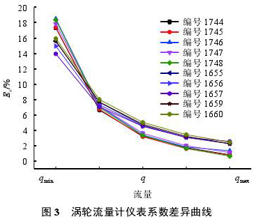 由图2可知,不同粘度点下流量计仪表系数差异很大,图3是10支流量计各流量点仪表系数误差曲线。仪表系数差异通过式(1)计算。结果显示,在低流量点仪表系数*大相差18%以上,在高流量点仪表系数*小相差约1%。