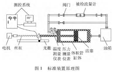 燃油动态流量标准装置的工作原理为:工作过程中电机旋转,驱动滚珠丝杠带动标准体积管活塞左行,排出液体流经控制阀门及被检流量计后,经过过滤器回到储油箱;同时,储油箱里的油经过下游管段进入标准体积管。