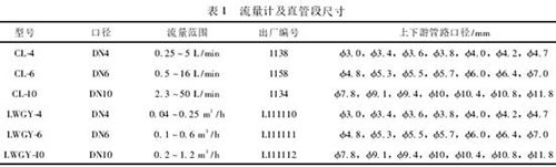 其中,0.75<K<1.2。在此基础上,每次试验过程中,根据流量计的流量范围,选取9个流量点,每个流量点校准3次。流量计的铭*信息及直管段口径选择详见表1。