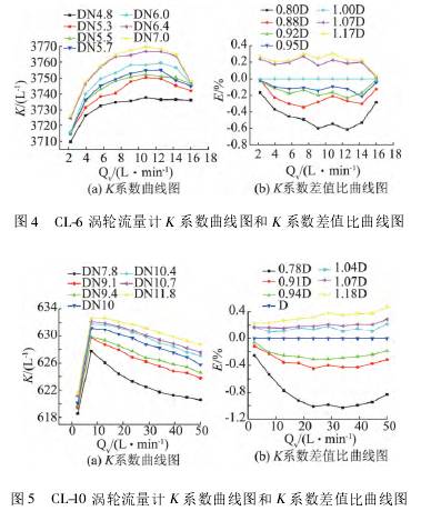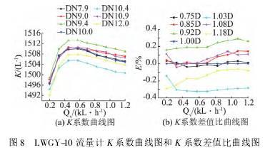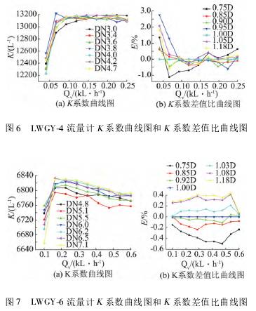 图3~图8分别为流量计的K系数曲线图和无量纲化后的差值比曲线图。