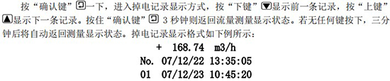 该记录表示:*一条掉电记录(No.1),停电时间为 07 年 12 月 22 日 13 点 35 分 05 秒,重新上电时间为 07 年 12 月 23 日 10 点 45 分 20 秒,掉电时的瞬时流量为 168.74m3/h,该次掉电时间长度为 21 小时 10 分钟。