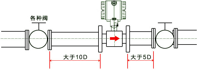 1、安装时液体流动方向应与传感器外壳上指示流向的箭头方向一致,且上游直管段应≥20dn,下游直管段应≥5dn,其中dn为管道内径。