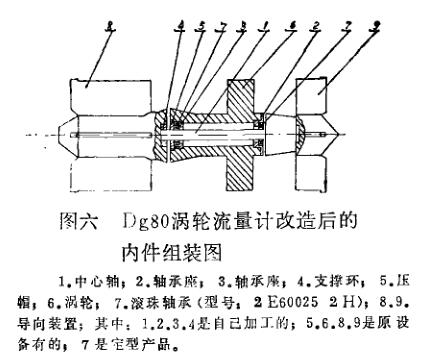 使甩中译杯料在液氨中发生膨胀,会使涡轮转速减小,甚至转不动。以后改为石墨轴.早t。使用甲段时间,由于轴承受滑动摩擦,李乍期高速雄转下很快磨损,间隙增大,涡羚轴串动,造成计量不准。。现在释们改用不锈钢滚珠轴承,这样将滑动摩擦改为滚动摩擦,起动转矩小,转动灵活。近两年在每年一度大检修中,拆下检查没有发现什么问题(改制零件的详细情况见图二、三、四、五、六)。