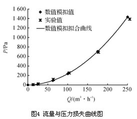 根据图4中压力损失随流量的变化趋势,可以将流量与压力损失之间的关系拟合曲线为二次多项式,其表达式为