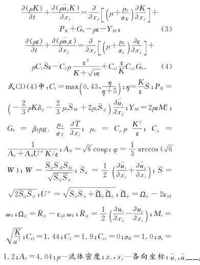 各向流速平均值;a—声速;μ—动力粘性系数;υ—运动粘性系数;K—湍流动能;ε—湍流耗散率;βT—膨胀系数;ωk—角速度;—时均转动速率张量;如不考虑浮力影响Gb=0,如流动不可压缩,=0,YM=0。